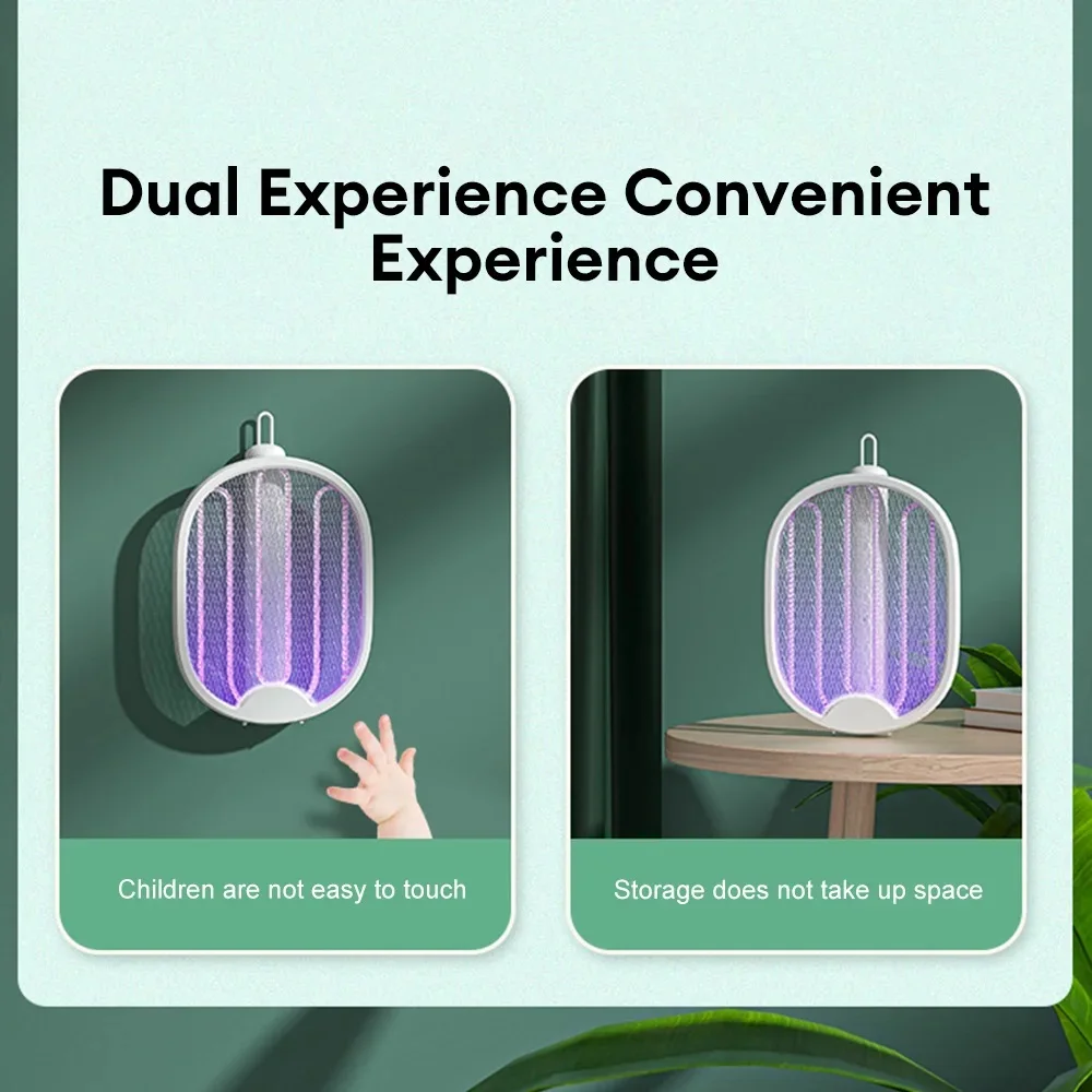 Equipped with a foldable stand, rechargeable battery, and dual safety switch, it functions as a swatter, trap, and zapper in one. Lightweight and portable, it provides safe, radiation-free pest control anywhere.